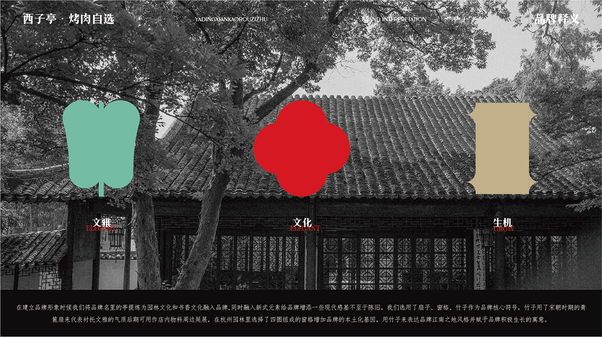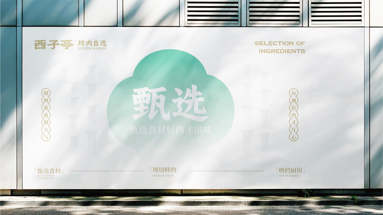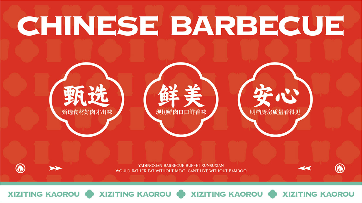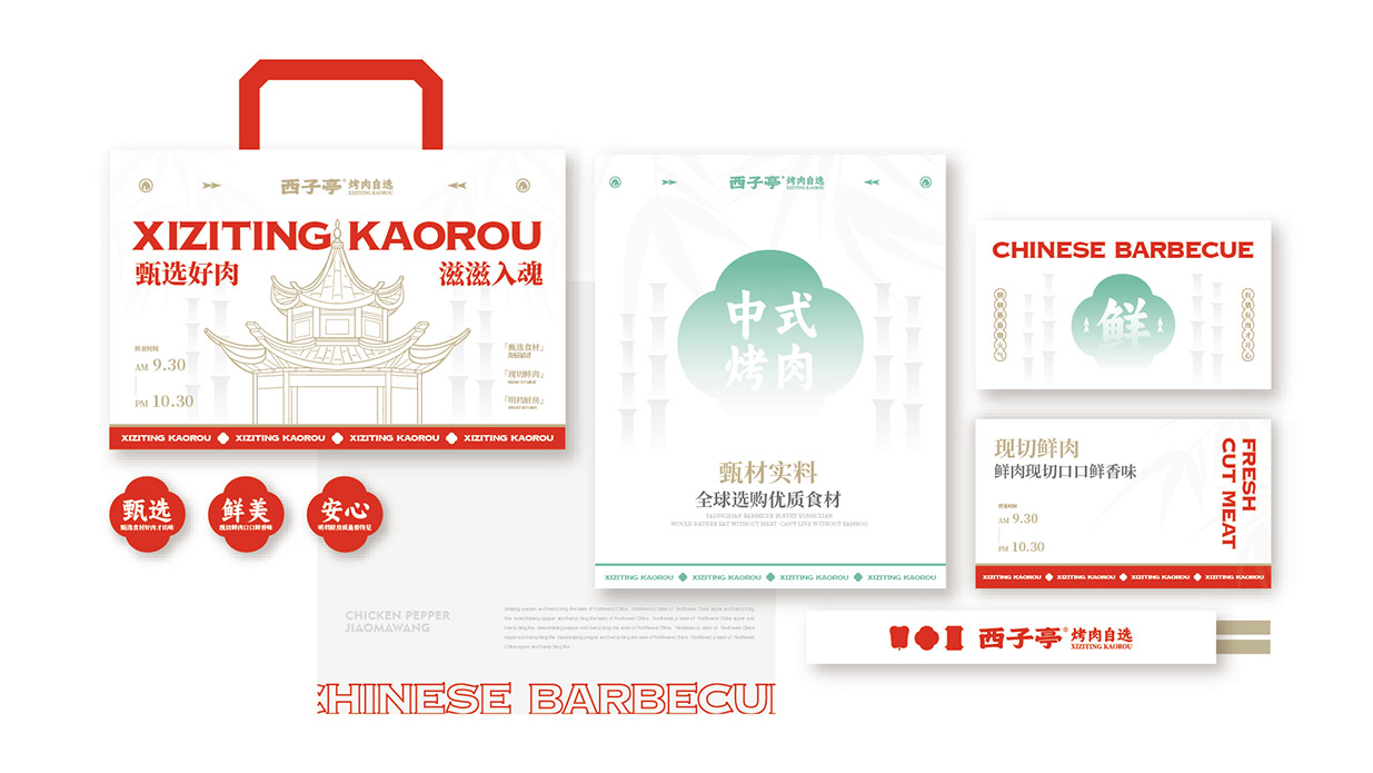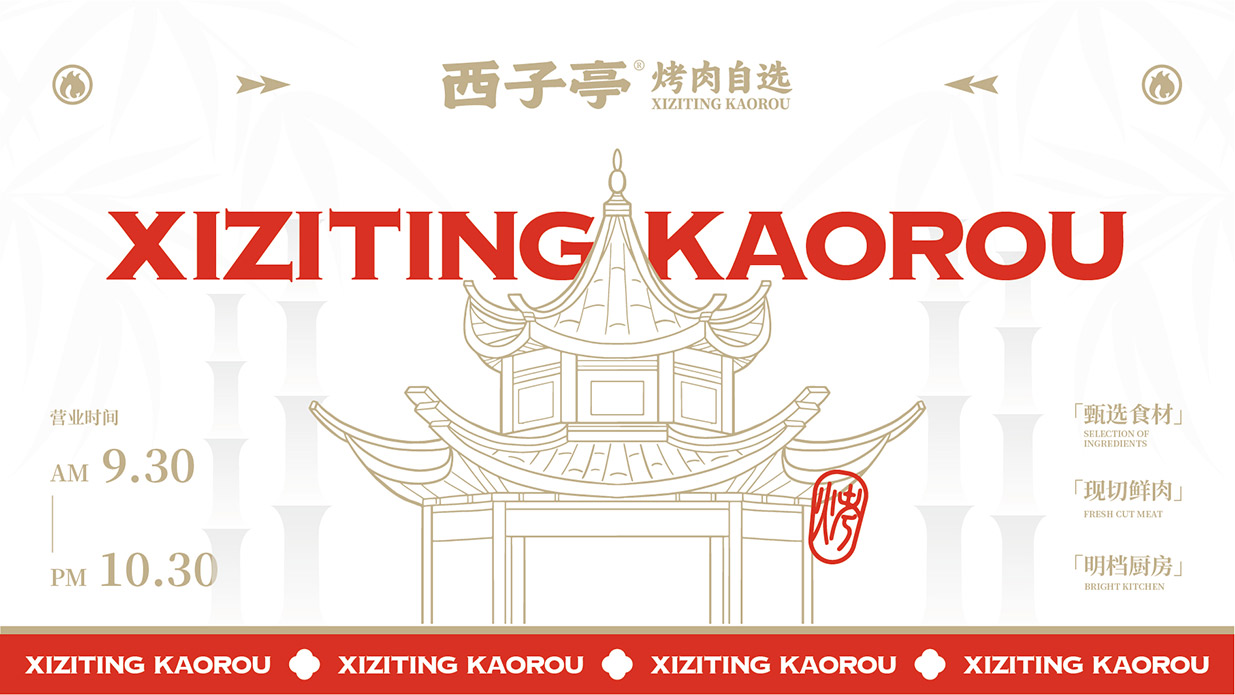 Introduction:西子亭炭火烤肉,秉承傳統(tǒng)炭火烤炙工藝,以老底子老味道為魂,讓美食回歸本真。品牌形象設(shè)計(jì)采用新中式風(fēng)格品牌運(yùn)用炭火紅與竹青,營造出溫馨、舒適的用餐氛圍。同時(shí),借助黑色的點(diǎn)綴,提升品牌的高貴與典雅。