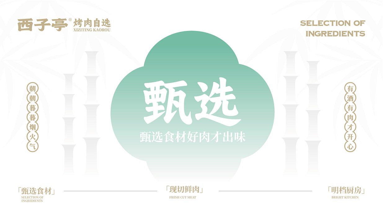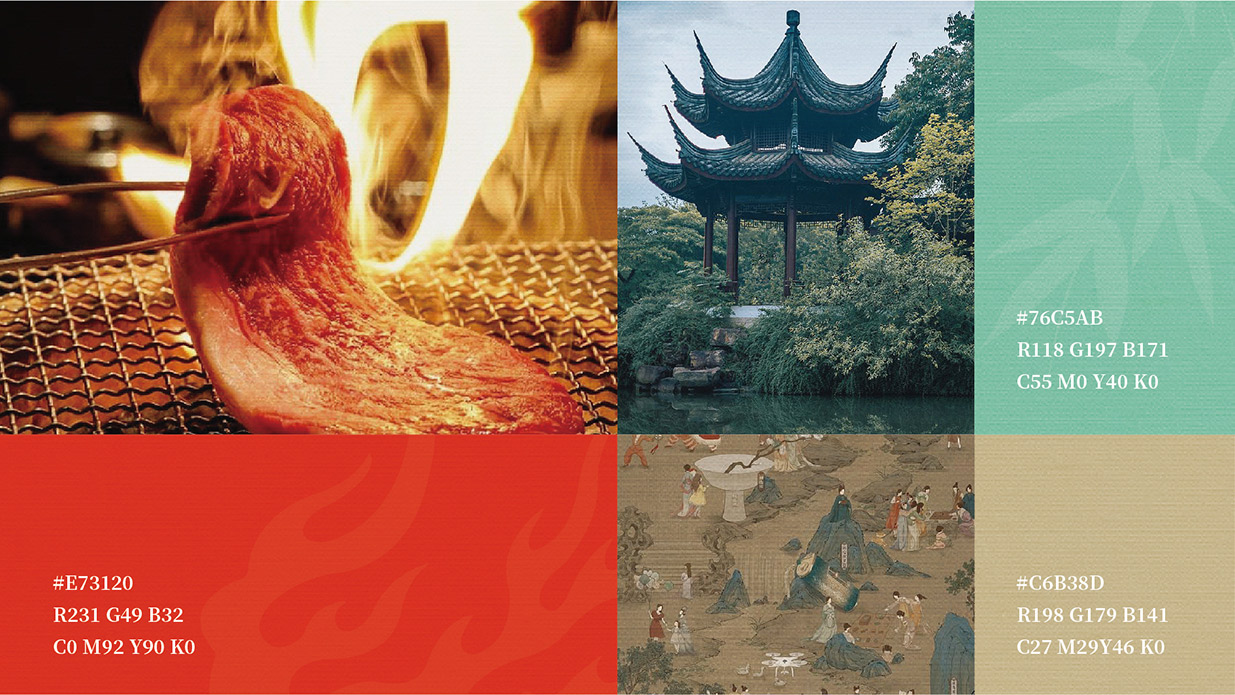 品牌圖案以蒲扇、青竹、空窗等傳統(tǒng)美學(xué)中的意向元素為主。蒲扇象征著夏日的清涼與舒適,青竹則代表堅(jiān)韌與高雅,空窗則寓意開放與包容。這些元素共同構(gòu)成了西子亭炭火烤肉的品牌形象,彰顯出品牌的獨(dú)特魅力。