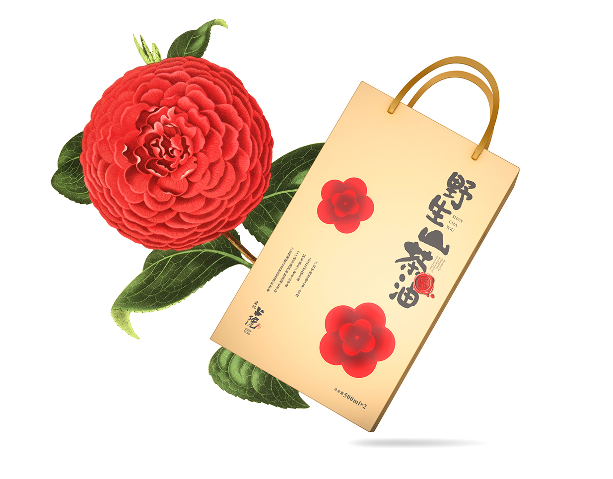 山茶花是產(chǎn)品的核心特色,因此我們采用鮮艷的色彩和細膩的圖案,將山茶花完美地呈現(xiàn)于包裝之上。山茶花的鮮艷與黑色的品名形成鮮明的對比,既突出了產(chǎn)品的高貴品質(zhì),又提升了整體視覺沖擊力。