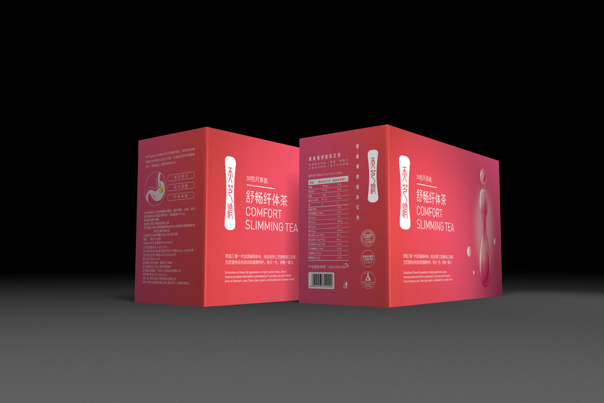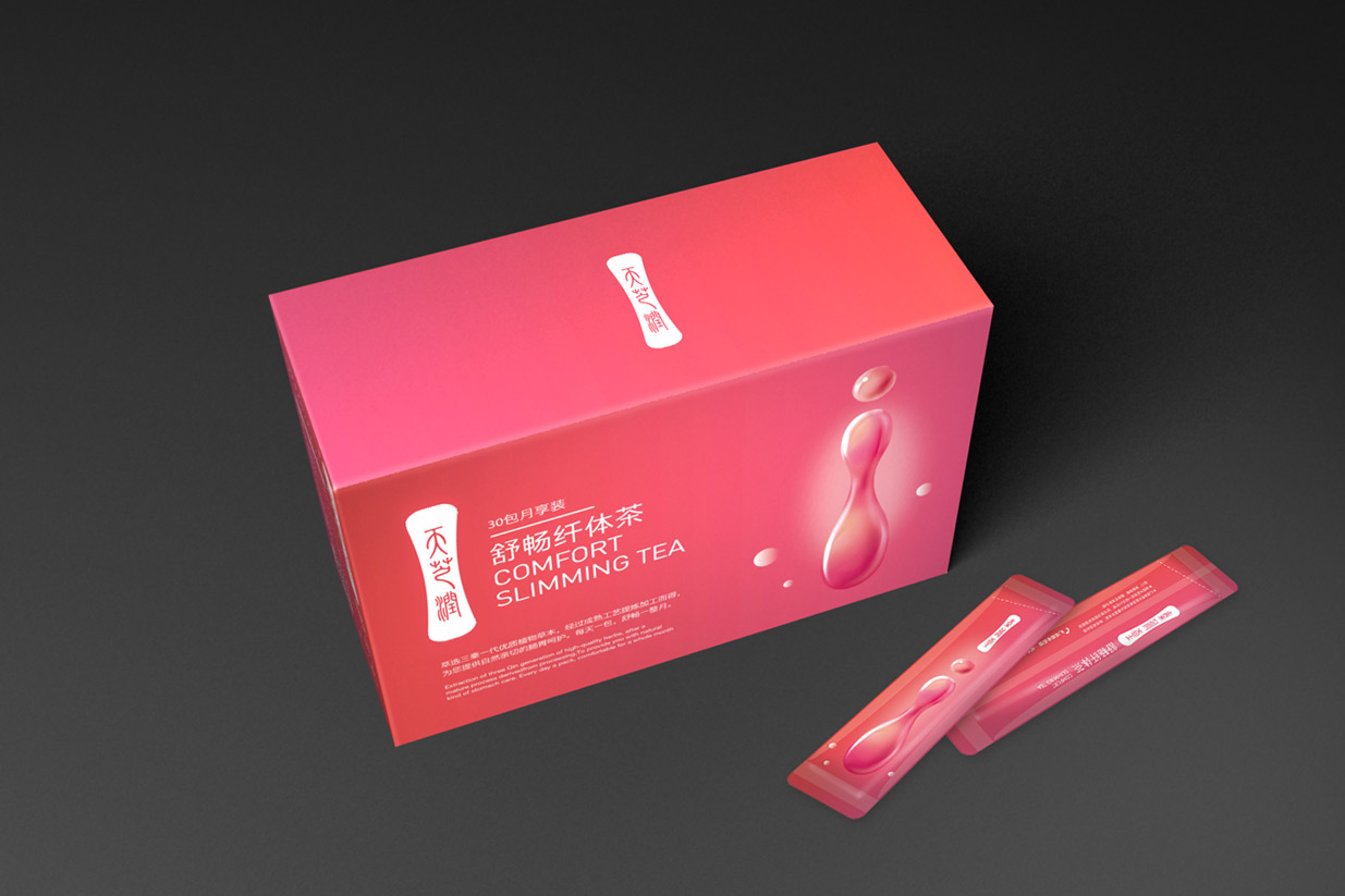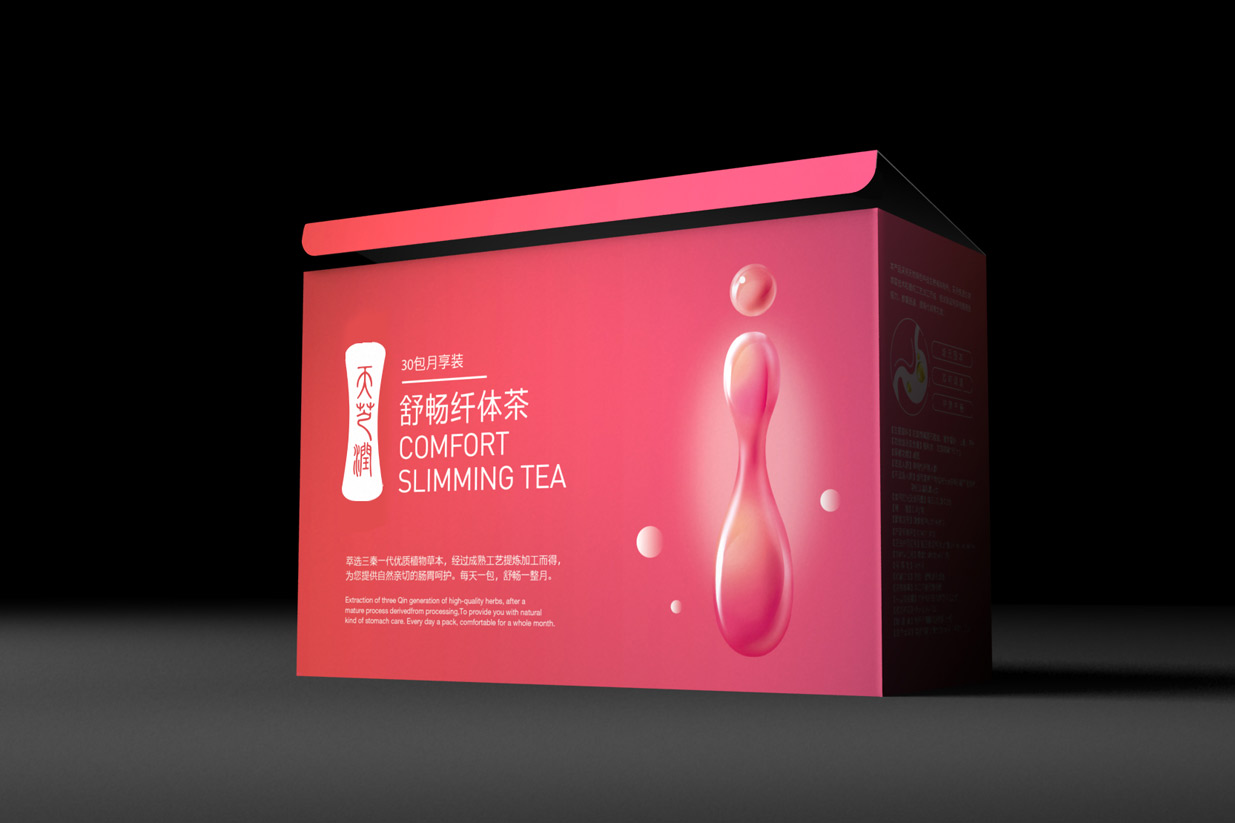 天芝潤(rùn)纖體茶為純天然生物精粹,能夠提高女性腸道健康排毒,從而提升氣色精神,因此知物在設(shè)計(jì)中采用了桃紅色,同時(shí)采用女性曲線與水滴相融合的設(shè)計(jì)元素,清晰的詮釋了產(chǎn)品的核心價(jià)值。