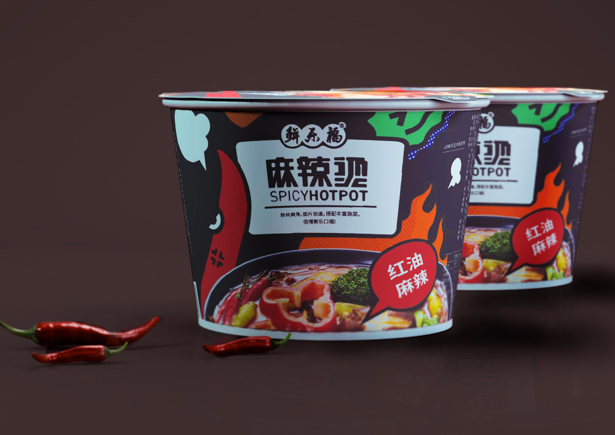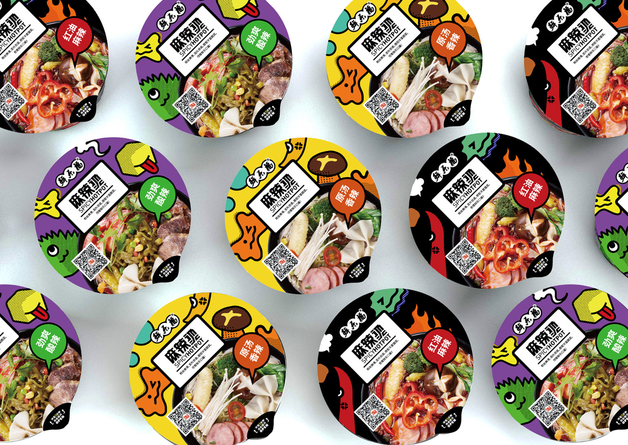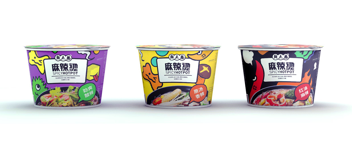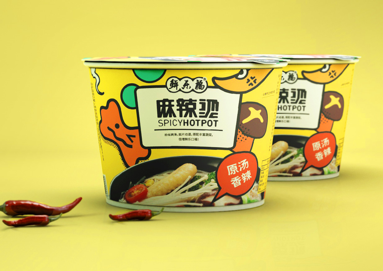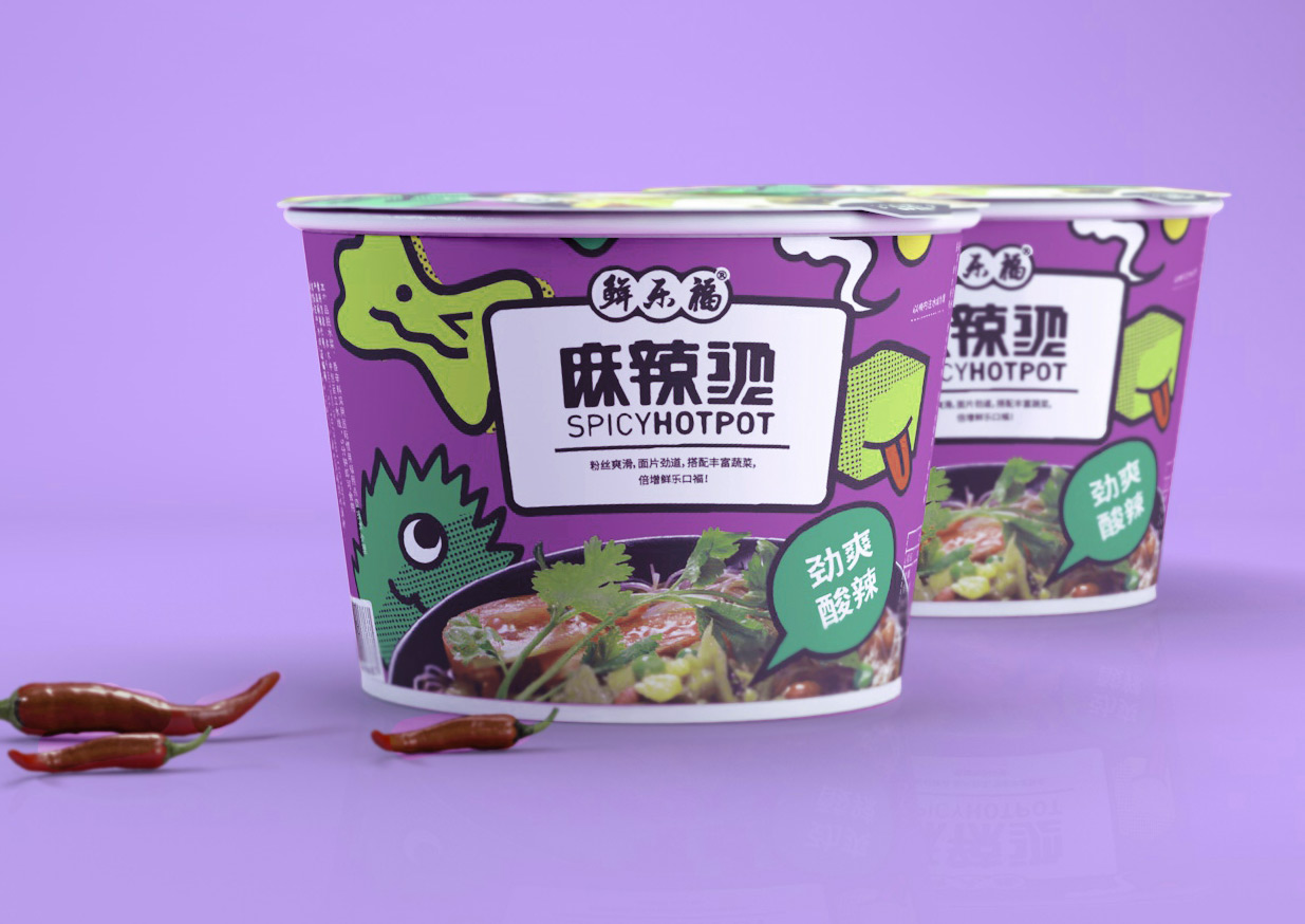 麻辣燙作為大家熟悉的小吃,鮮樂福將其開發(fā)為速食產(chǎn)品,知物在設(shè)計(jì)時(shí)希望呈現(xiàn)出與傳統(tǒng)方便面不同的視覺風(fēng)格,將食材趣味化設(shè)計(jì),年輕活潑的調(diào)性更加契合年輕人的審美需求。