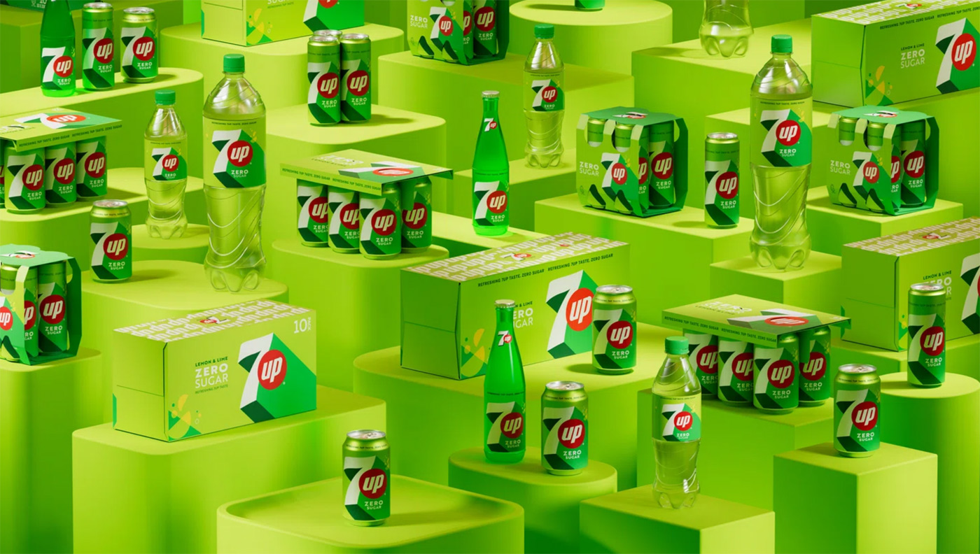 設(shè)計的方向是立體運(yùn)動感, 7Up保持綠色主色調(diào),添加“熱情的柑橘色調(diào)”。同時,高對比度線條的三維外觀,營造出向上移動的感覺。這種傾斜的呈現(xiàn)方式與字體相呼應(yīng),符合該品牌的“UPliftment”定位。在字體中,增加了幾何元素,更好的體現(xiàn)能量和活力感。