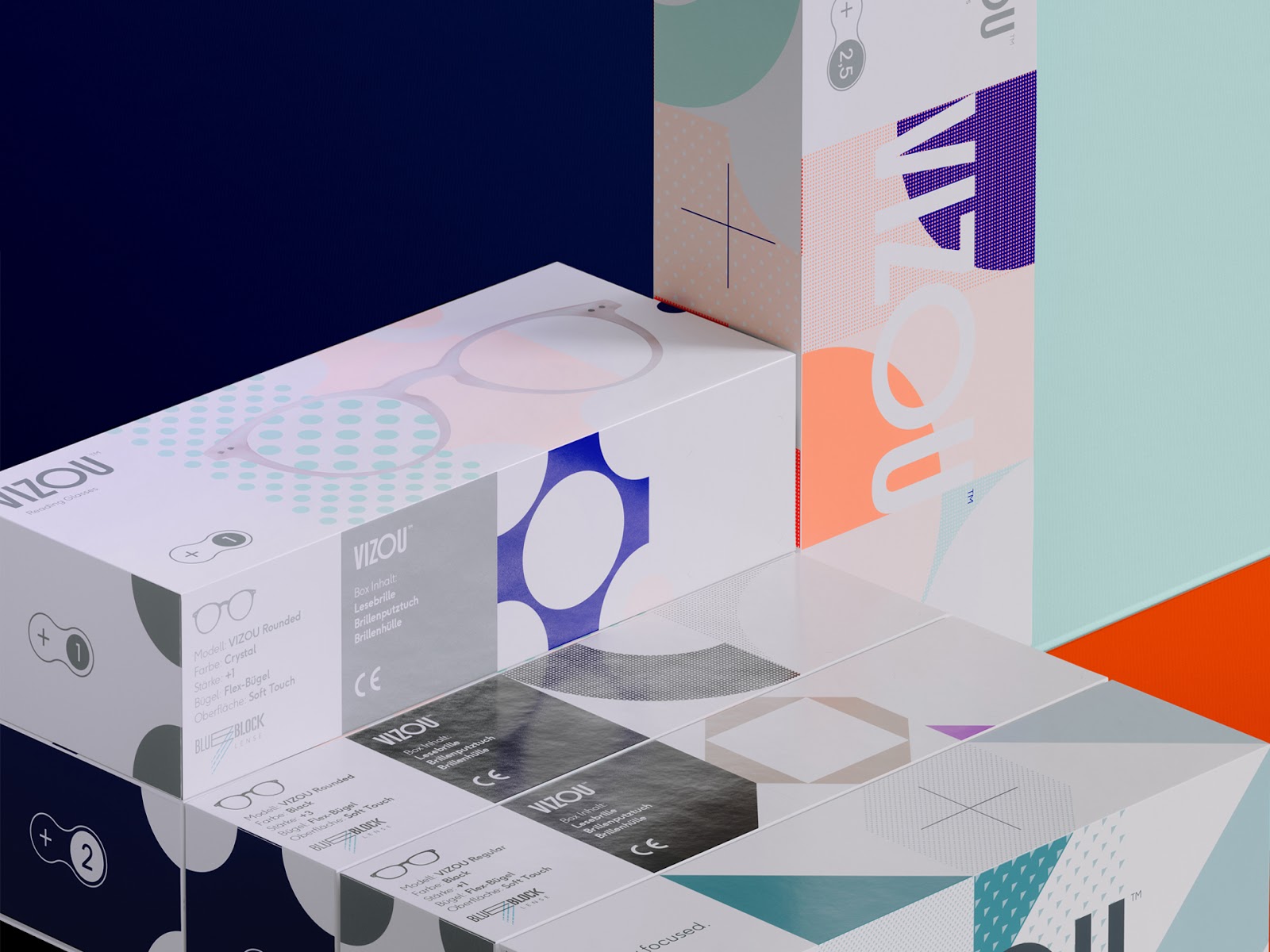 設(shè)計(jì)師希望表現(xiàn)產(chǎn)品享受每個(gè)細(xì)節(jié)-閱讀的新樂趣這一理念。根據(jù)各個(gè)眼鏡模型的屈光度,形式和色調(diào)而變化,設(shè)計(jì)師用圖形化的方式加以表達(dá),呈現(xiàn)出與眾不同的視覺效果。